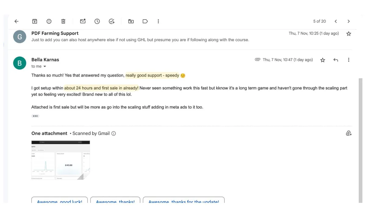 While results vary, many students see their first sales within days. Muna made $6K in her first 32 days without ads. Mark hit $61K in 40 days. The key is following our proven system exactly as we teach it however ensure you take a long term view with this.
